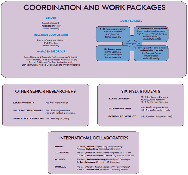 The RUNSAFE Research group is organised with a responsible leader, a management group and a research coordinator. Research is conducted through each of the 4 work packages, of which each is managed by one or two leaders; there are international collaborators, commercial partners, sports organisations and –federations. RUNSAFE treatment assists in diagnostics and treatment of injured runners included in Danish research projects.